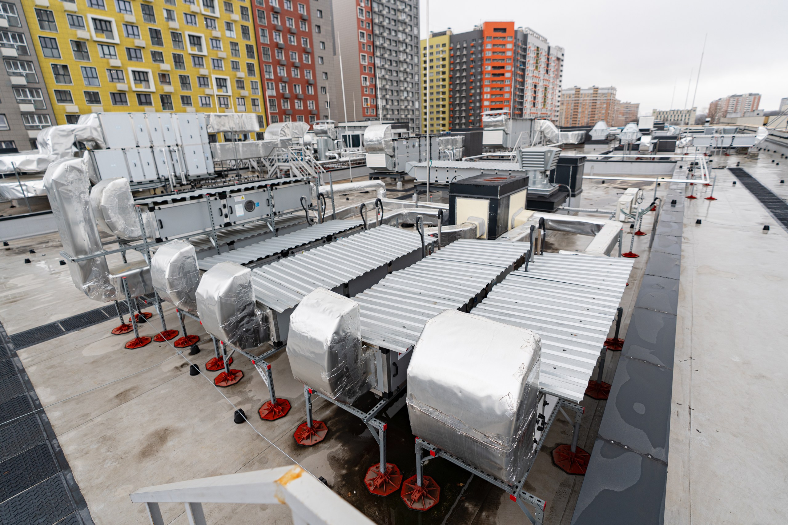 Другой сложностью было проведение работ на высоте. Чтобы монтировать на кровле 2-этажного торгового комплекса с потолками от 4 до 6 метров системы вентиляции, дымоудаления и холодоснабжения, нам пришлось прибегнуть к использованию 8 вышек-тур и автокранов грузоподъемностью 250 и 350 тонн, которые могут перемещаться по городу исключительно в ночное время.